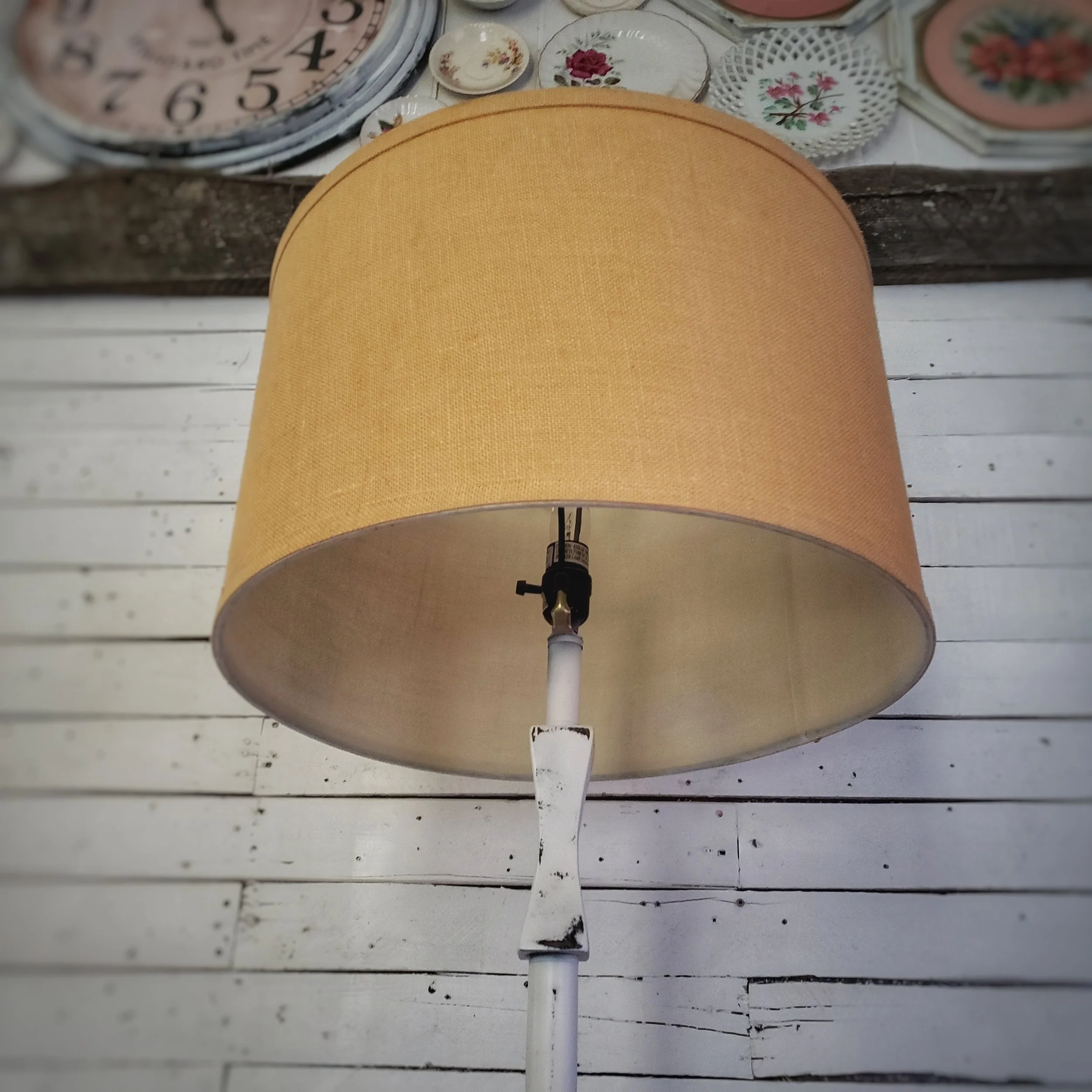 Nice metal shabby white lamp with a large shade. In excellent working condition.