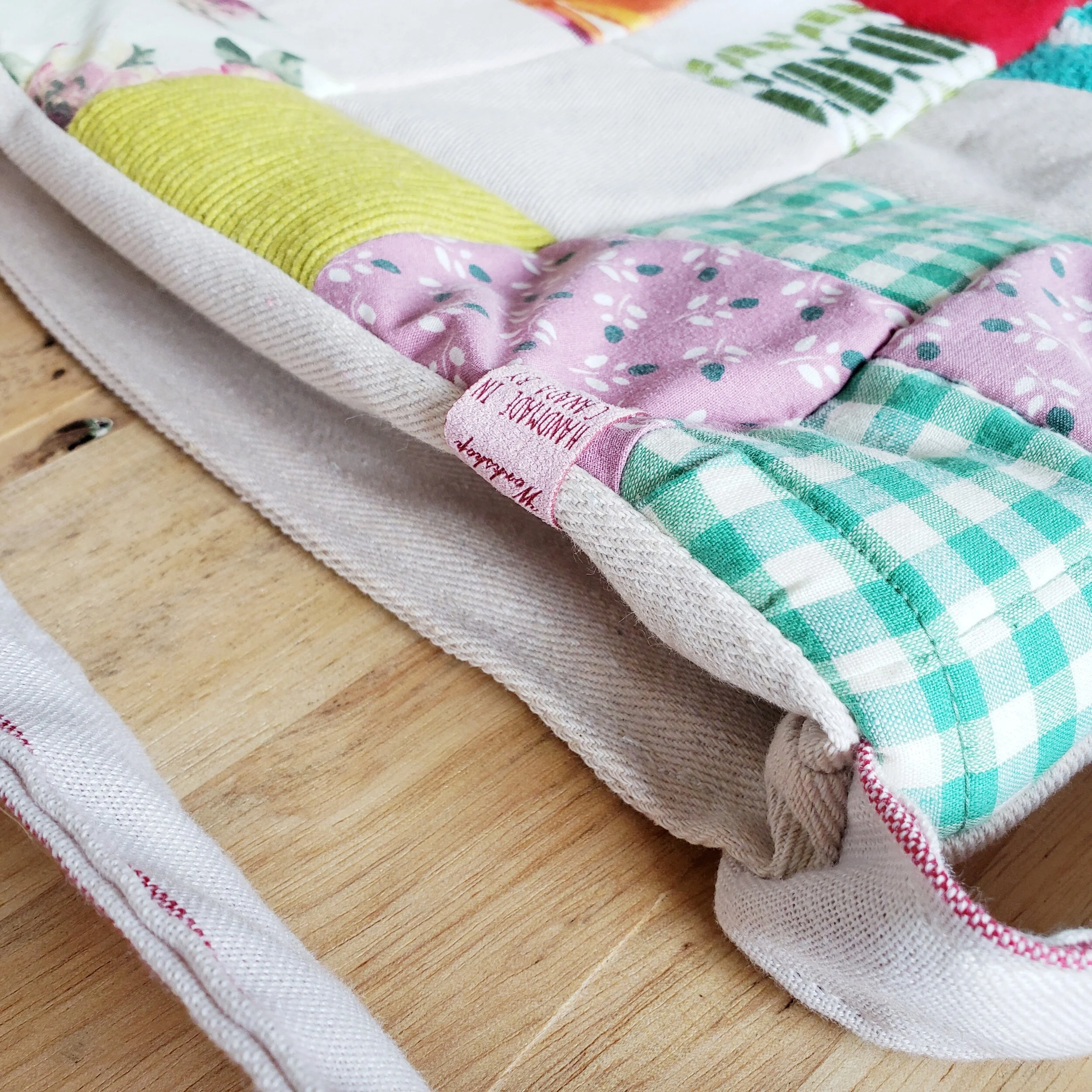 Handmade by Roseberry Workshop using assorted reclaimed fabrics.